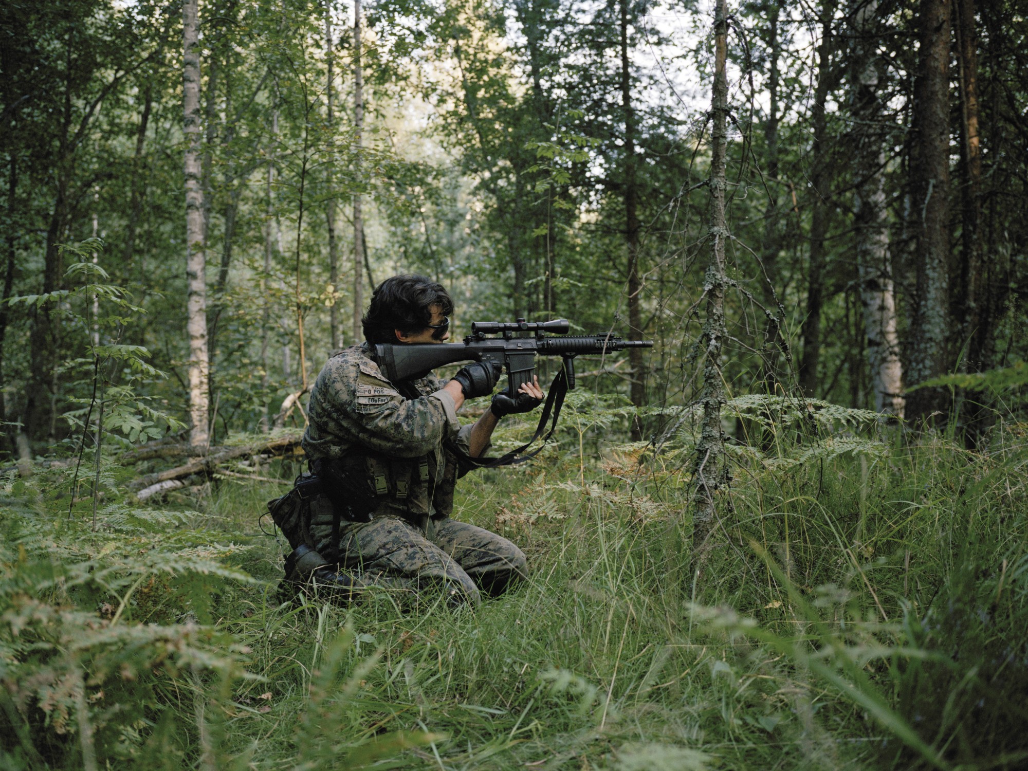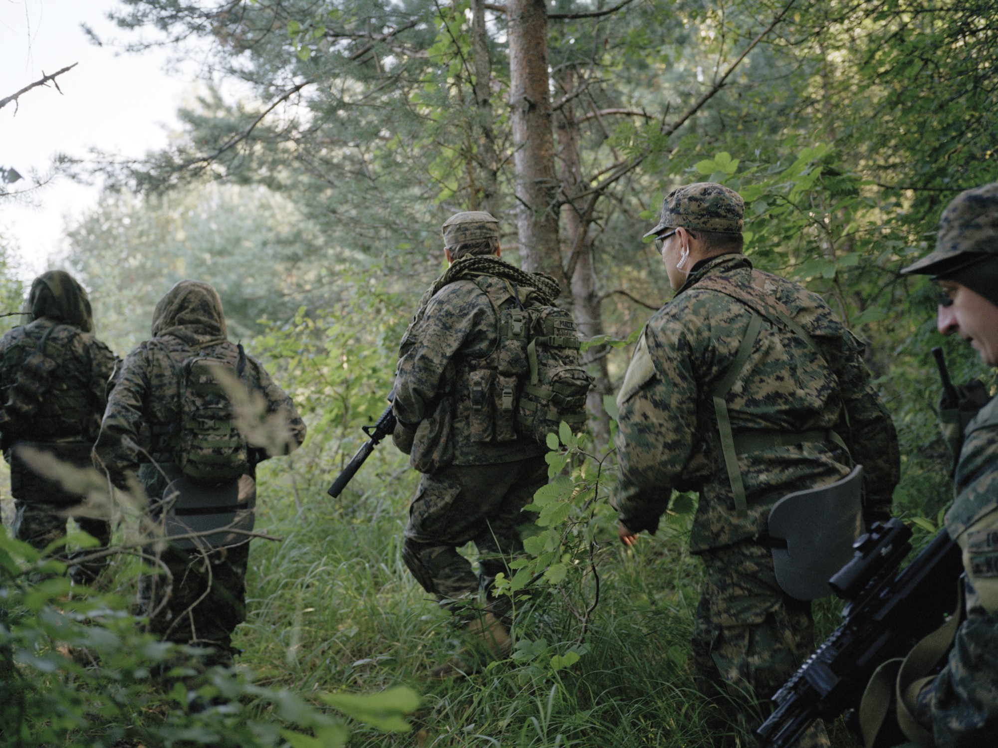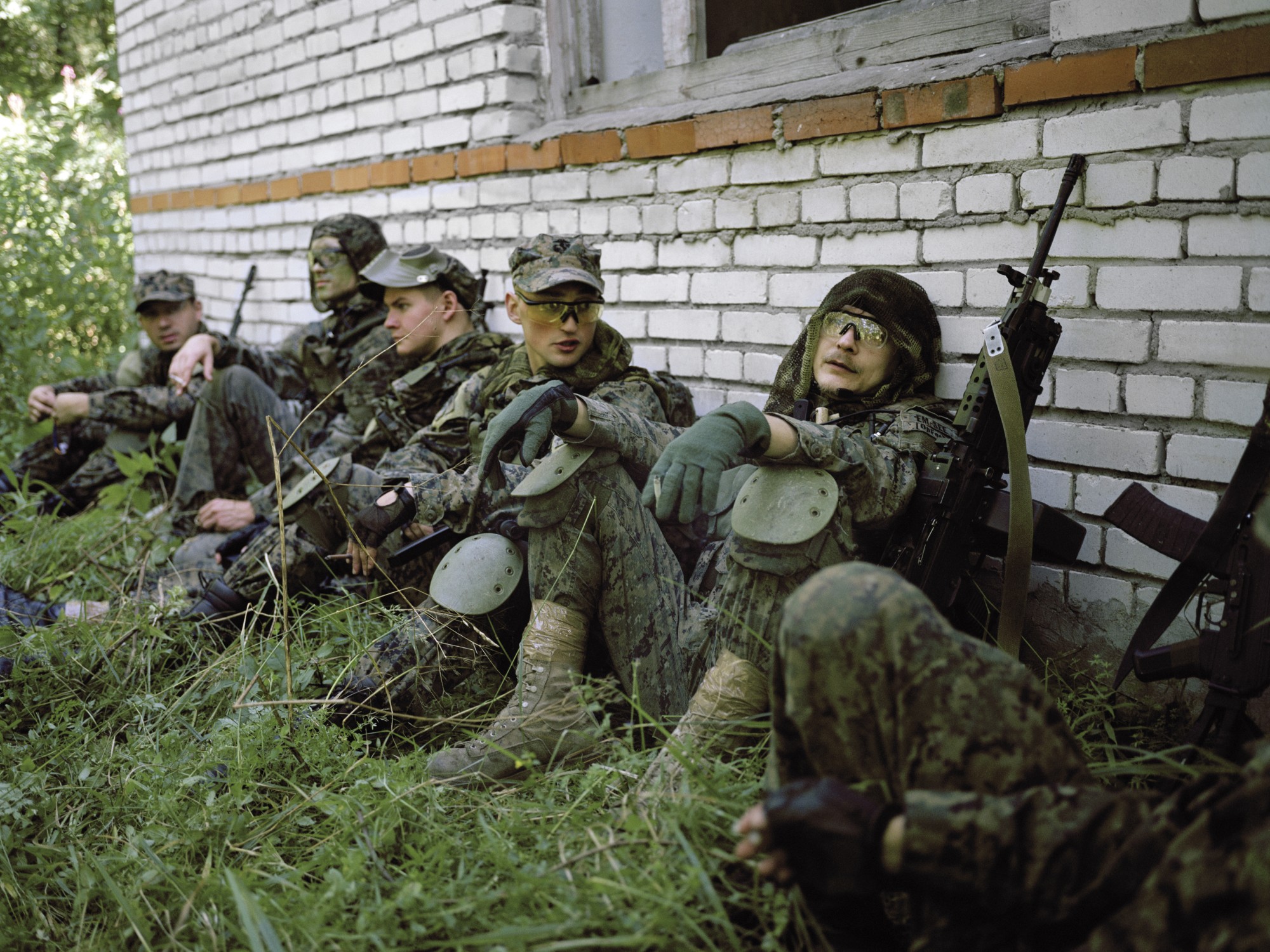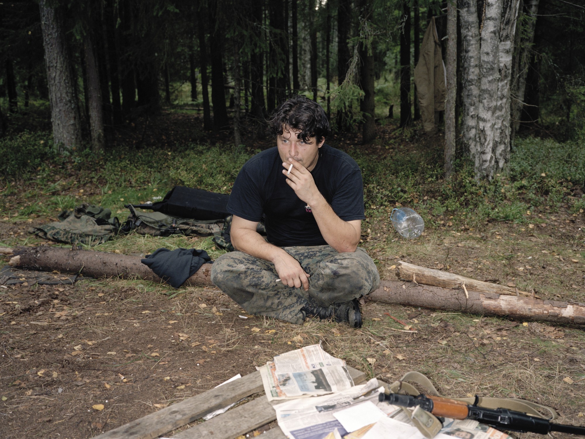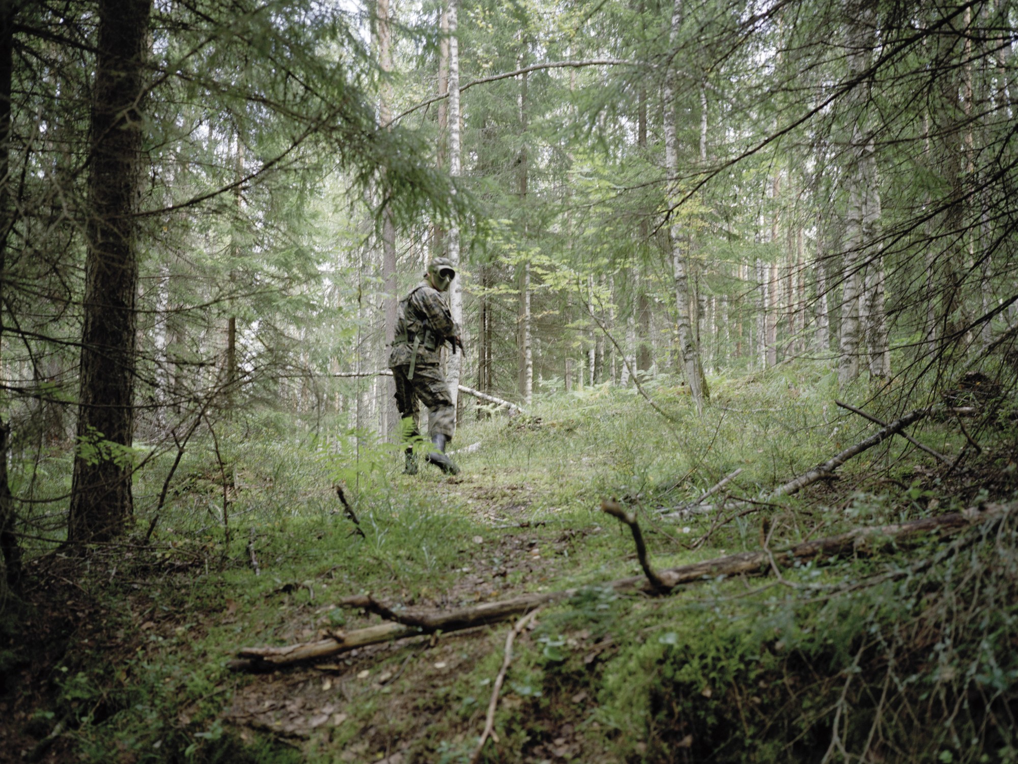 The pictures of Joscha Steffens’ series OPFOR - Wildboyz convey the impression one deals with a document of war. This impression is not at all made by the composition of the photographer or his stagings, in contrary it is created by the protagonists of a war game society, that is simulating war by stylized poses, uniforms and weapons. Members of the military, soldiers in spe and other like-minded people from around the world organized and connected through web forums eventually meet and fight in forests and other abandoned territories. They join forces in hierarchical structured armies and march into battle. The photo and video works Steffens shows us have been re- corded in Russia, whereas these games of war are taking place as well in the US, Europe and Asia. During the days of fighting all contacts to the outside world are forbidden for the participants as the created scenario shall remain ›real‹. On the boarder of society and legality they train close combat situations common for civil war scenarios, street and house fighting as well as patrolling and securing large territories in rural landscapes and forests. In an intriguing way Wildboyz brings home the lust of play and how it is connected to the lust of violence and the longing of humans for authoritarian structures.
